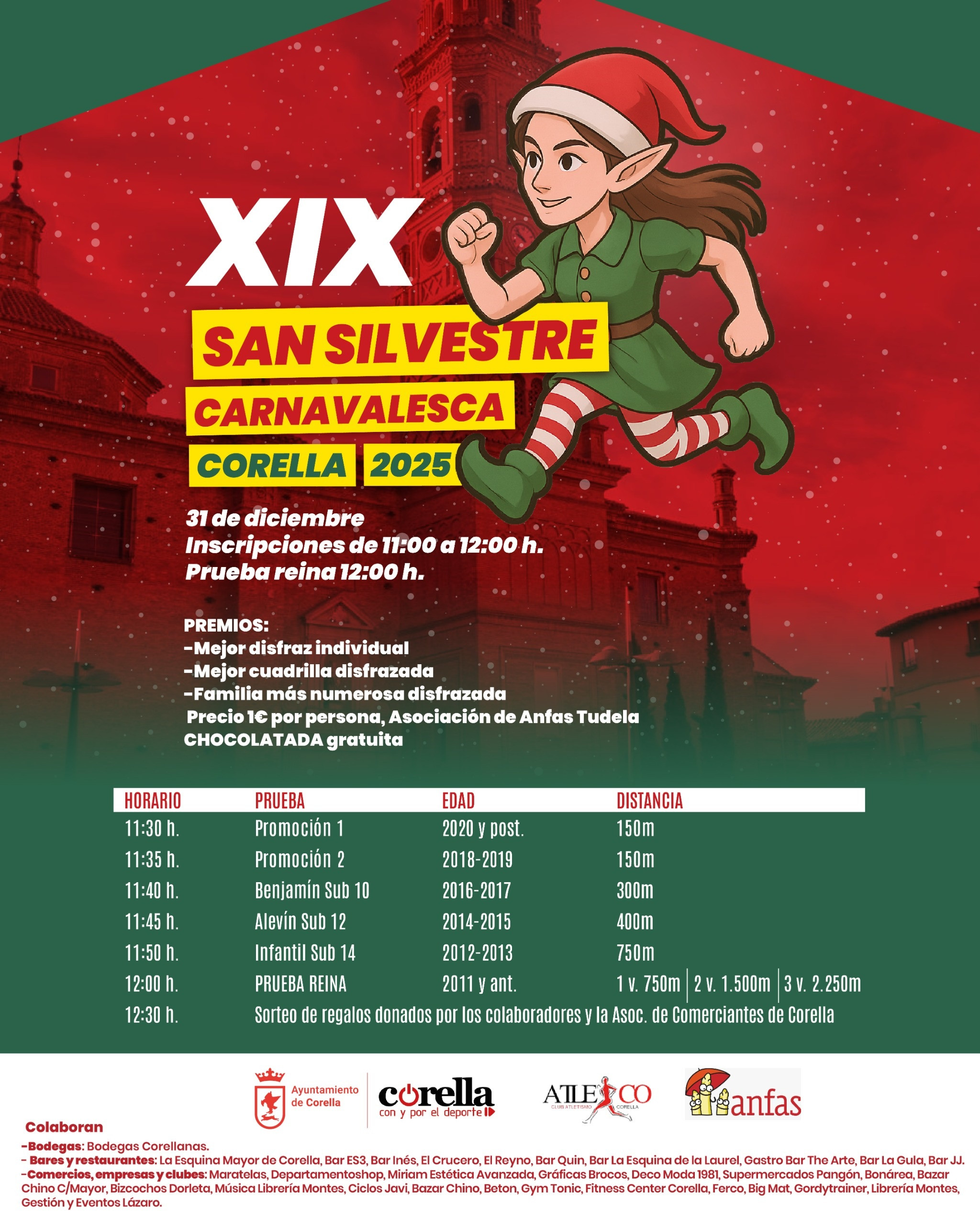 11:30 h. a 11:50 h. Inscripciones de las pruebas por categorías (Promociones, Benjamín, Alevín e Infantil) de la XIX San Silvestre Carnavalesca. Inscripción de la categoría Reina 11:00 a 11:30 h. (1 €/persona). Salida desde Plaza de los Fueros.
