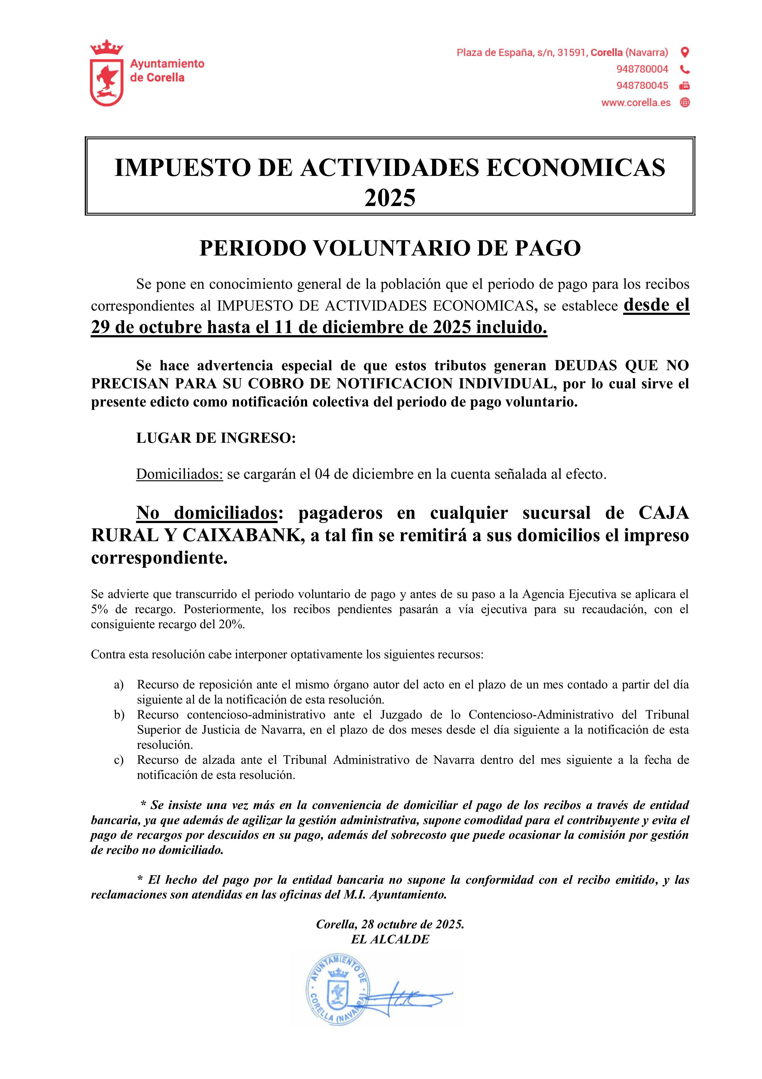 Se pone en conocimiento general de la población que el periodo de pago para los recibos correspondientes al IMPUESTO DE AC...