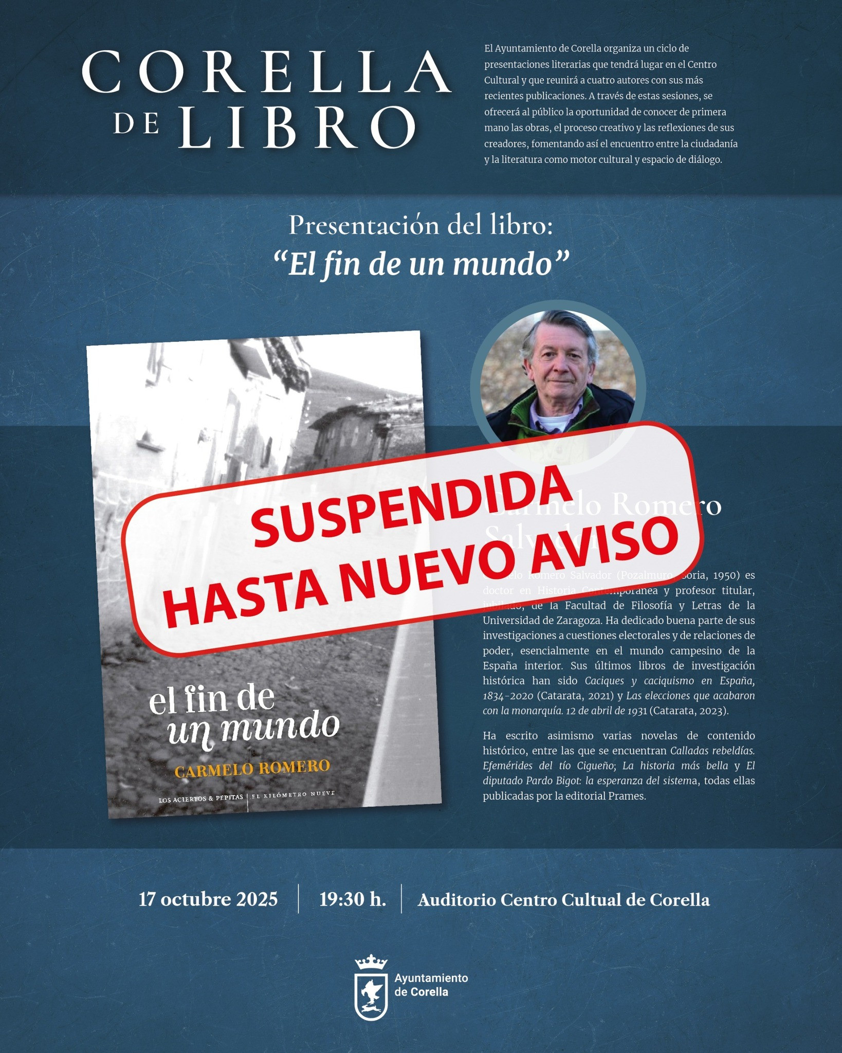 La presentación del libro “El fin de un mundo” del doctor en Historia Contemporánea por la Universidad de Zaragoza D. Carmelo Romero Salvador, prevista para el día 17 de octubre de 2025, dentro del ciclo de presentaciones literarias organizadas por el Ayuntamiento de Corella en el ciclo “Corella de libro”, queda suspendida hasta nuevo aviso.