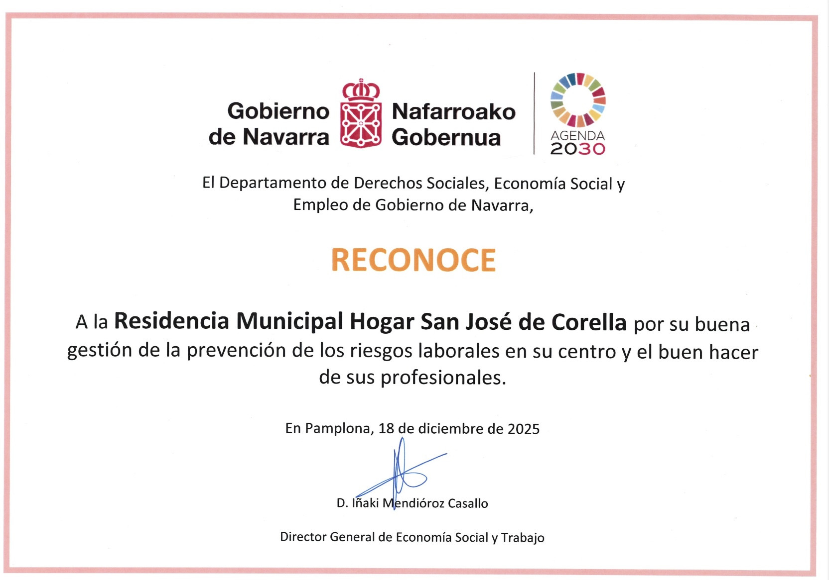 La Residencia Hogar San José de Corella ha recibido hoy un reconocimiento del Gobierno de Navarra por sus buenas prácticas en prevención de riesgos laborales, dentro de una jornada dedicada a visibilizar experiencias destacadas en este ámbito.