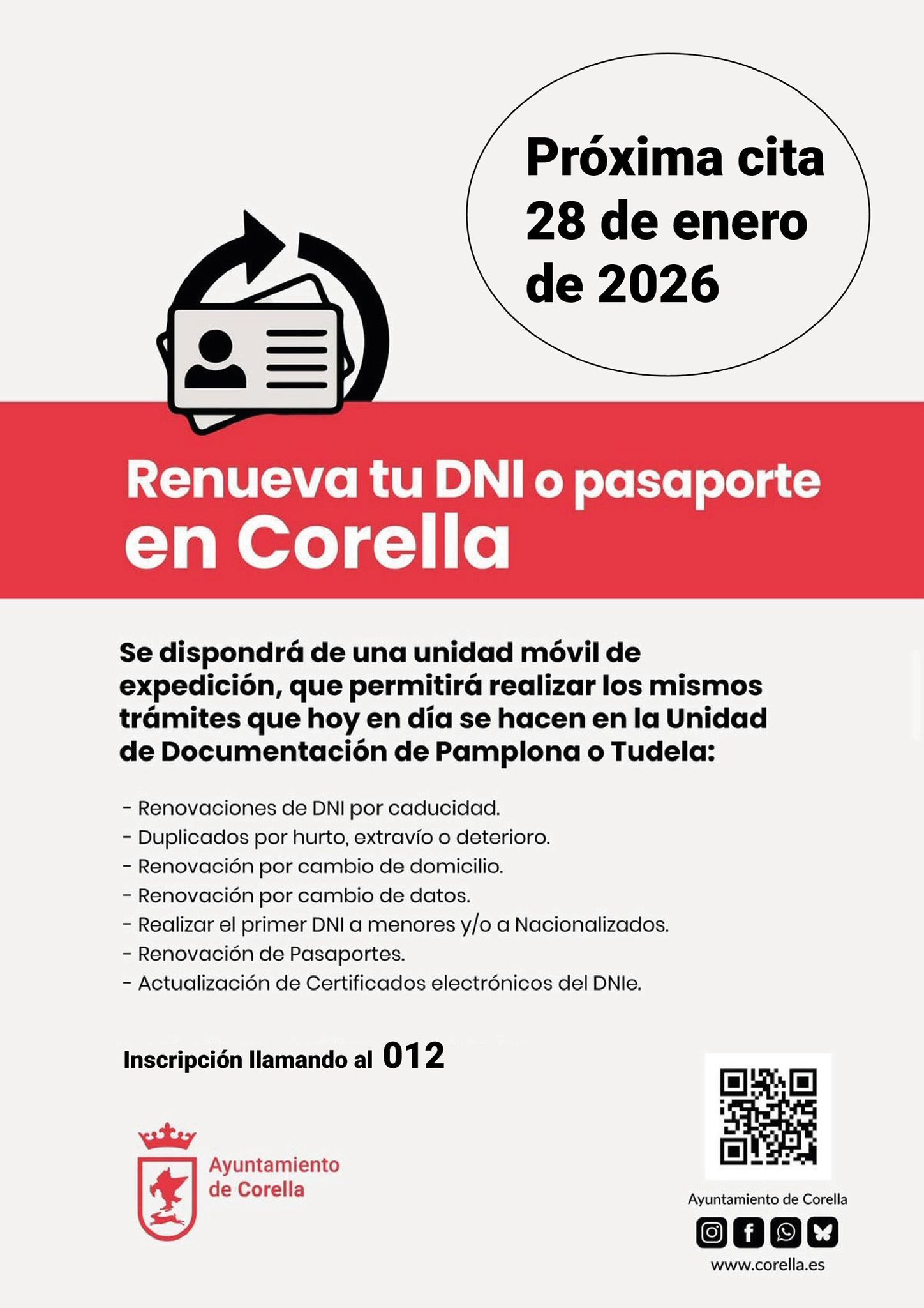 El próximo 28 de enero estará en Corella el vehículo DNI-RURAL (VIDOC - Vehículo Integral de Documentación) de la Policía Nacional para expedir o renovar DNI y/o Pasaportes, y/o renovar los certificados del DNI electrónico.