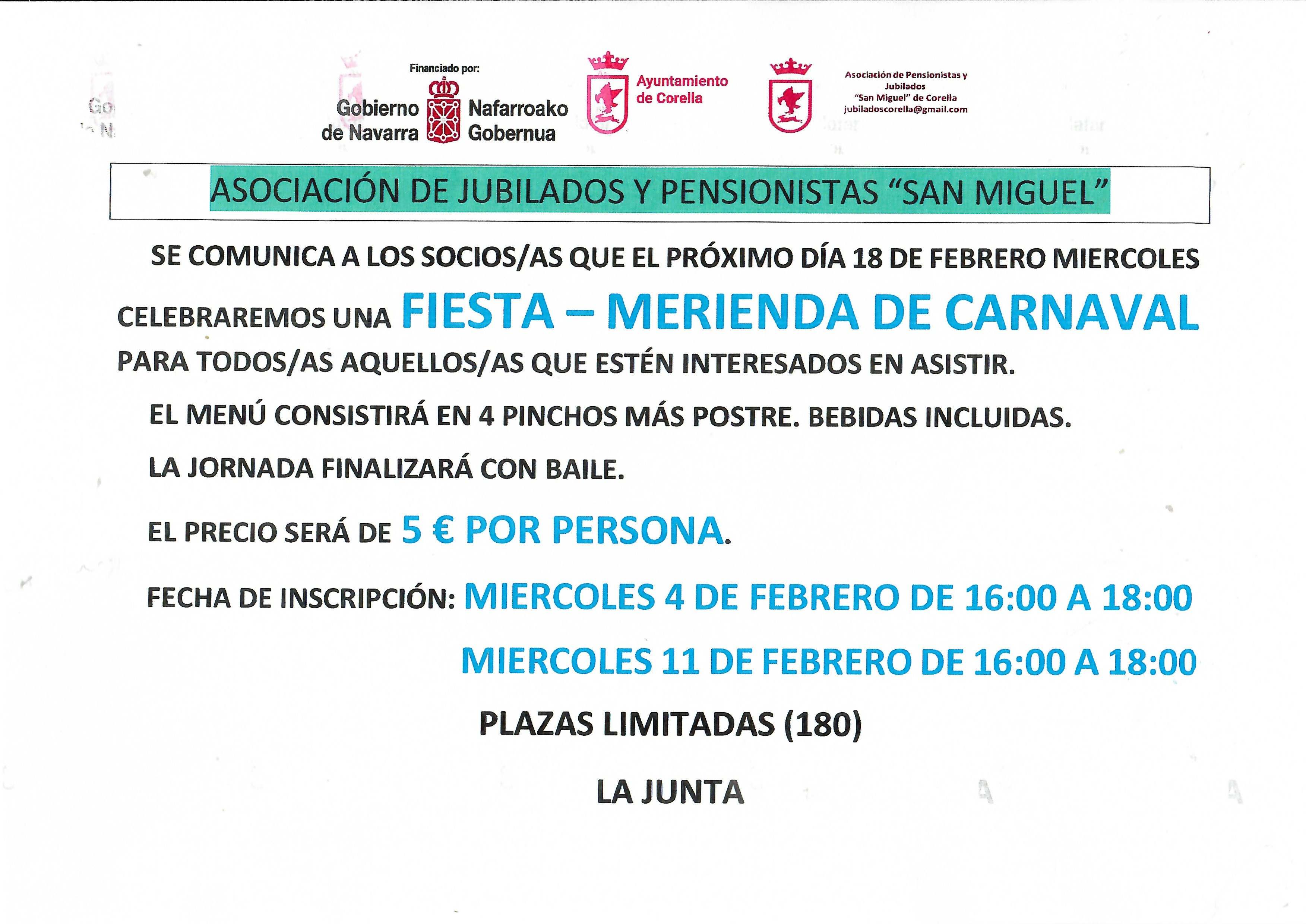 4 pinchos+postre+bebidas+baile. Precio: 5 euros/persona. Inscripciones los días 4 y 11 de febrero, de 16:00 a 18:00 horas.