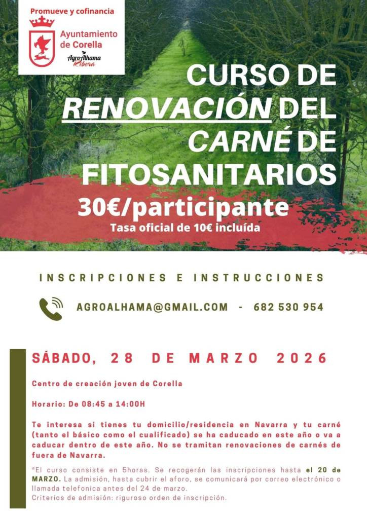 Curso de renovación del carné de fitosanitarios en Corella. De 8:45 a 14:00 horas.