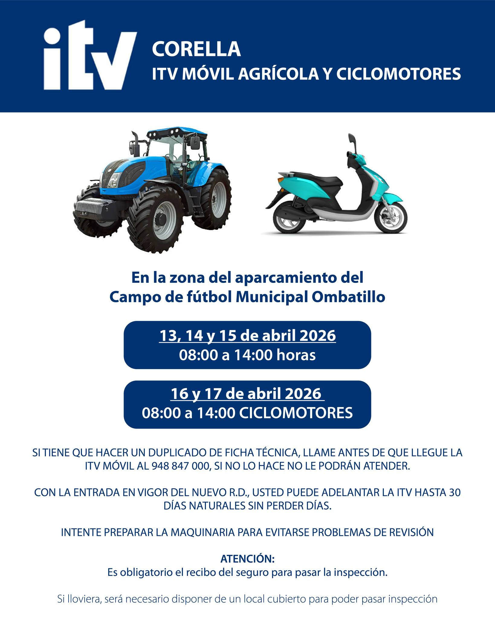 La ITV móvil agrícola y de ciclomotores estará en Corella para realizar las inspecciones.